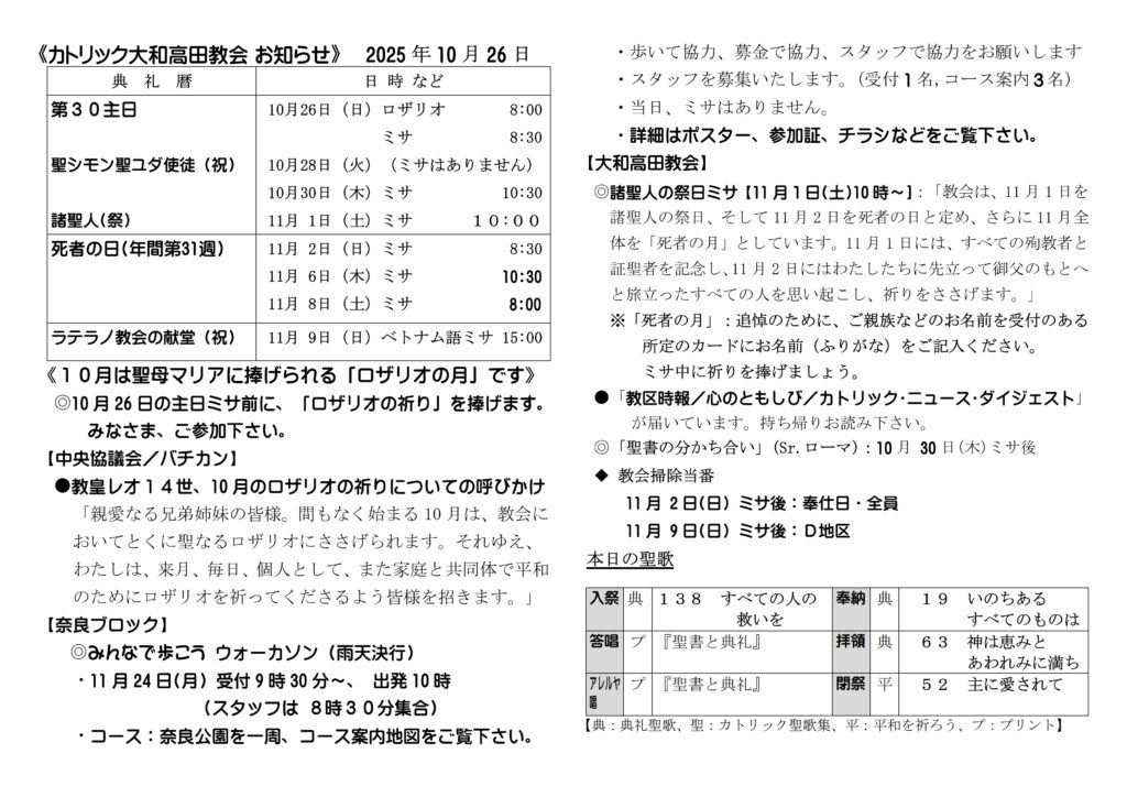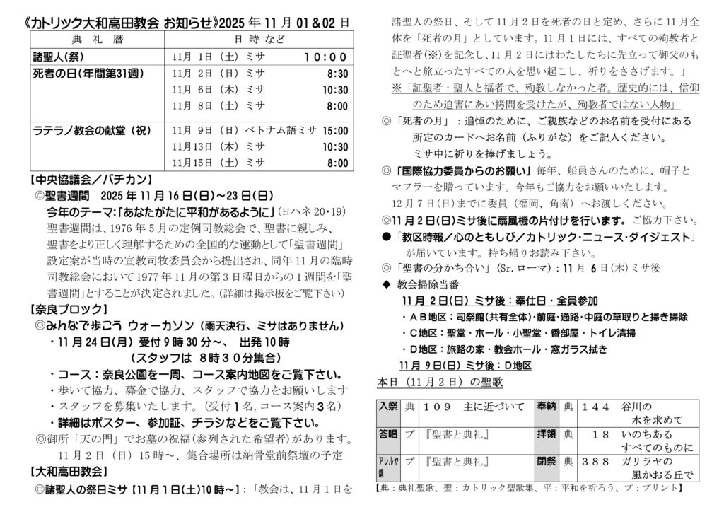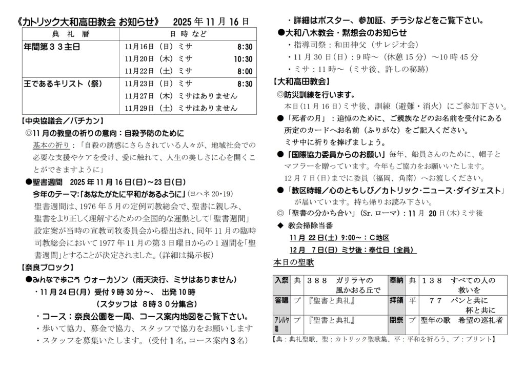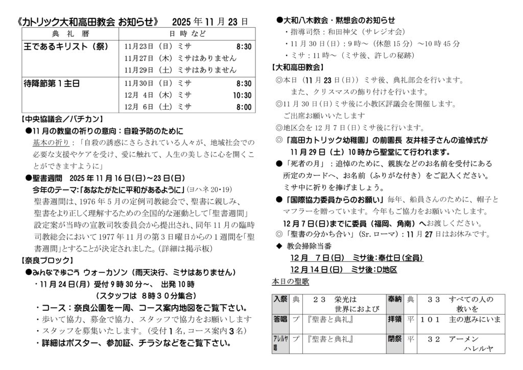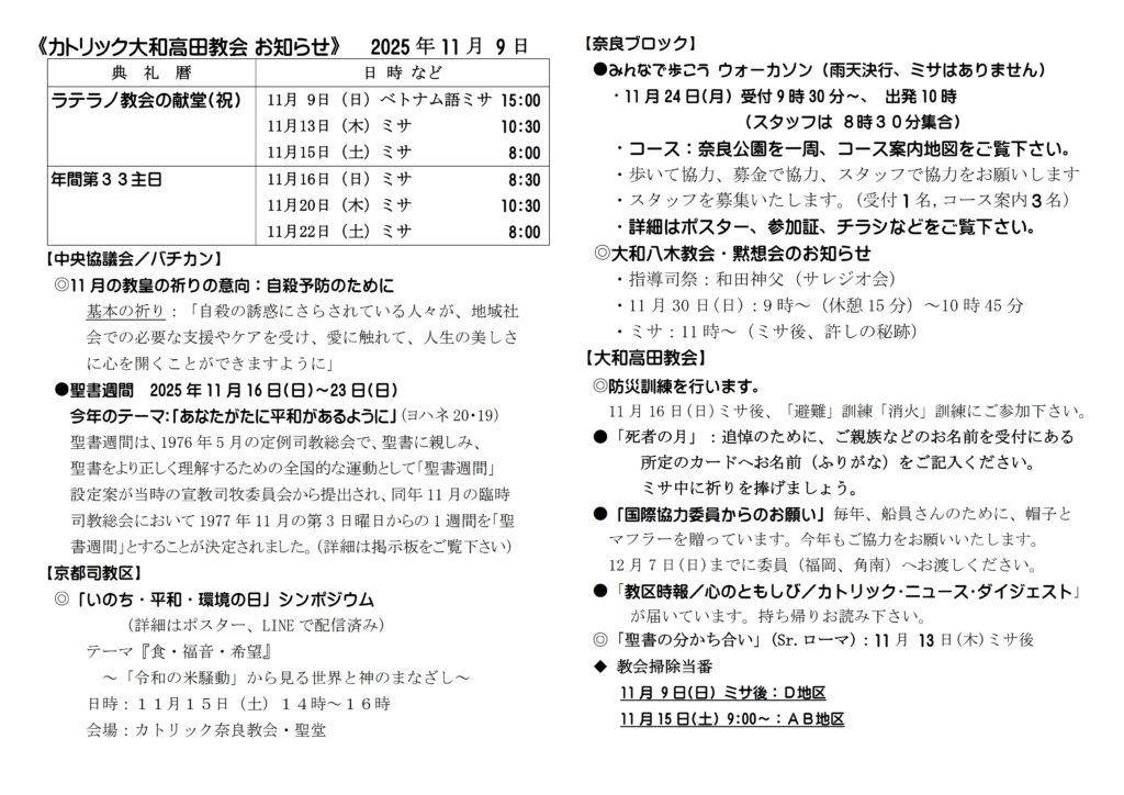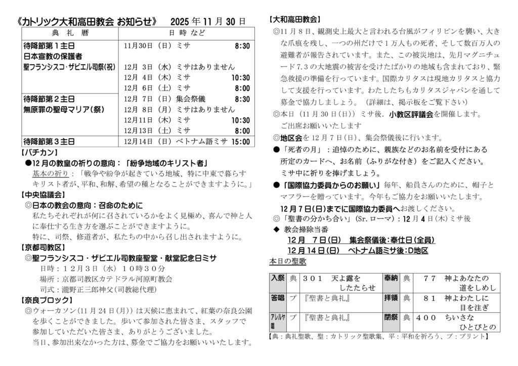 9月20日㈯西大和・大和八木・大和高田の3教会合同で、宮津教会、報恩寺教会(車上)、福知山教会へ聖年の巡礼に行ってきました。随行の神父様・シスター含め42名となりました。宮津教会の神父様、役員の大変な歓迎を受けました。福知山教会では神父様は教区の行事で外出されていましたが、役員の方々が歓迎していただきました。18時前には無事に高田市駅前のバス停に帰ってきました。関係の方々のご協力により聖年の巡礼は無事終わり感謝です。有難うございました。